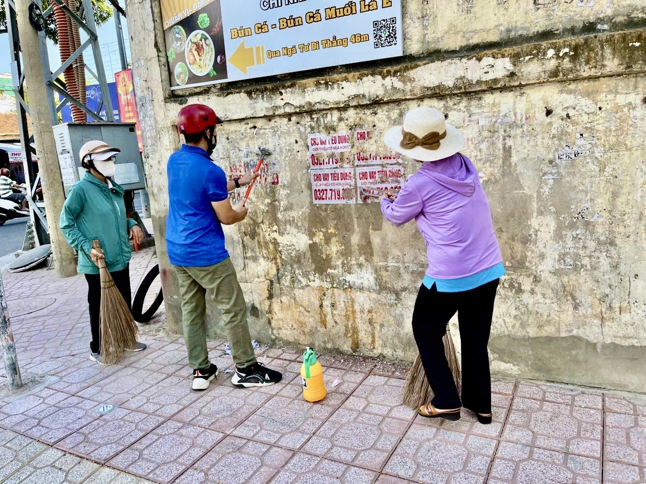 cán bộ và người dân các tổ dân phố tích cực tẩy xóa quảng cáo, rao vặt giữ VSMT