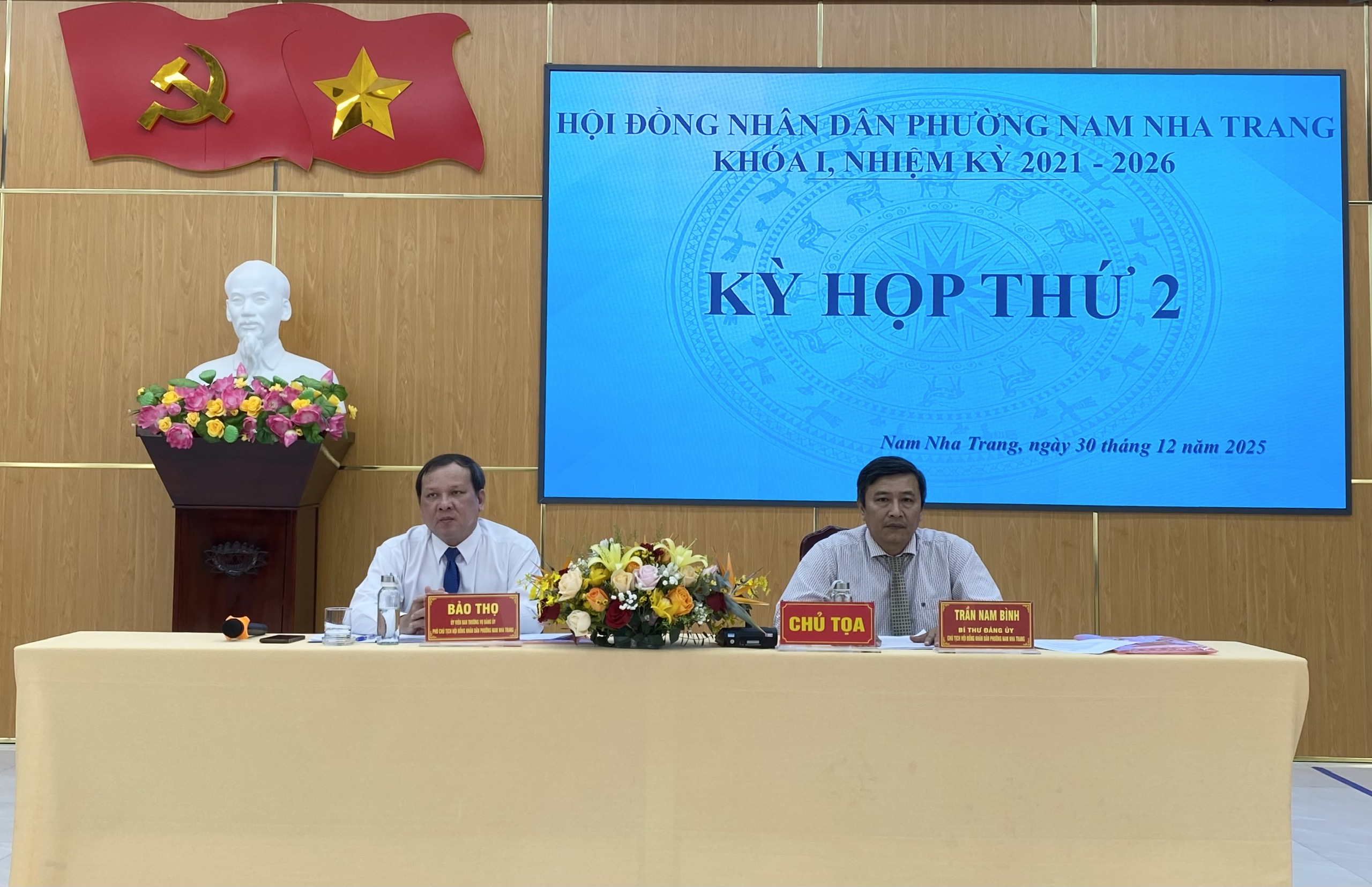 Chiều 30-12, Hội đồng nhân dân phường Nam Nha Trang tổ chức kỳ họp thứ 2 và tổng kết hoạt động Hội đồng nhân dân phường nhiệm kỳ 2021 - 2026. Các đồng chí: Trần Nam Bình - Tỉnh ủy viên, Bí thư Đảng ủy, Chủ tịch HĐND phường; Bảo Thọ - Ủy viên Ban Thường vụ Đảng ủy, Phó Chủ tịch HĐND phường chủ trì điều hành kỳ họp. Tham dự kỳ họp có các đồng chí: Lê Thị Huyên - Phó Bí thư Thường trực Đảng ủy, Chủ nhiệm Ủy ban Kiểm tra Đảng ủy; Nguyễn Văn Minh - Phó Bí thư Đảng ủy, Chủ tịch UBND phường; Lê Thị Thiên Lý - Ủy viên Ban Thường vụ Đảng ủy, Chủ tịch Ủy ban Mặt trận Tổ quốc Việt Nam phường; Trần Thị Thu Hiền - Ủy viên Ban Thường vụ Đảng ủy, Trưởng Ban Xây dựng Đảng Đảng ủy.