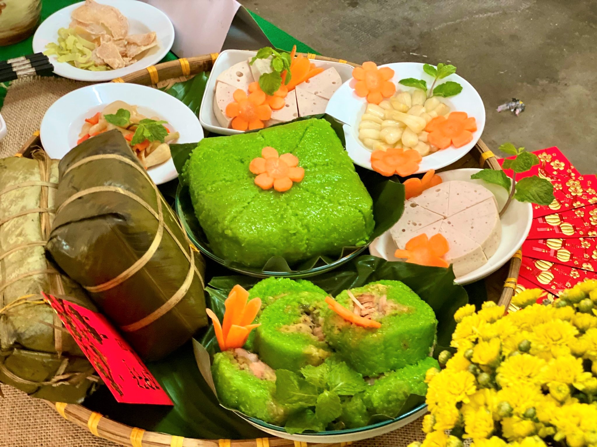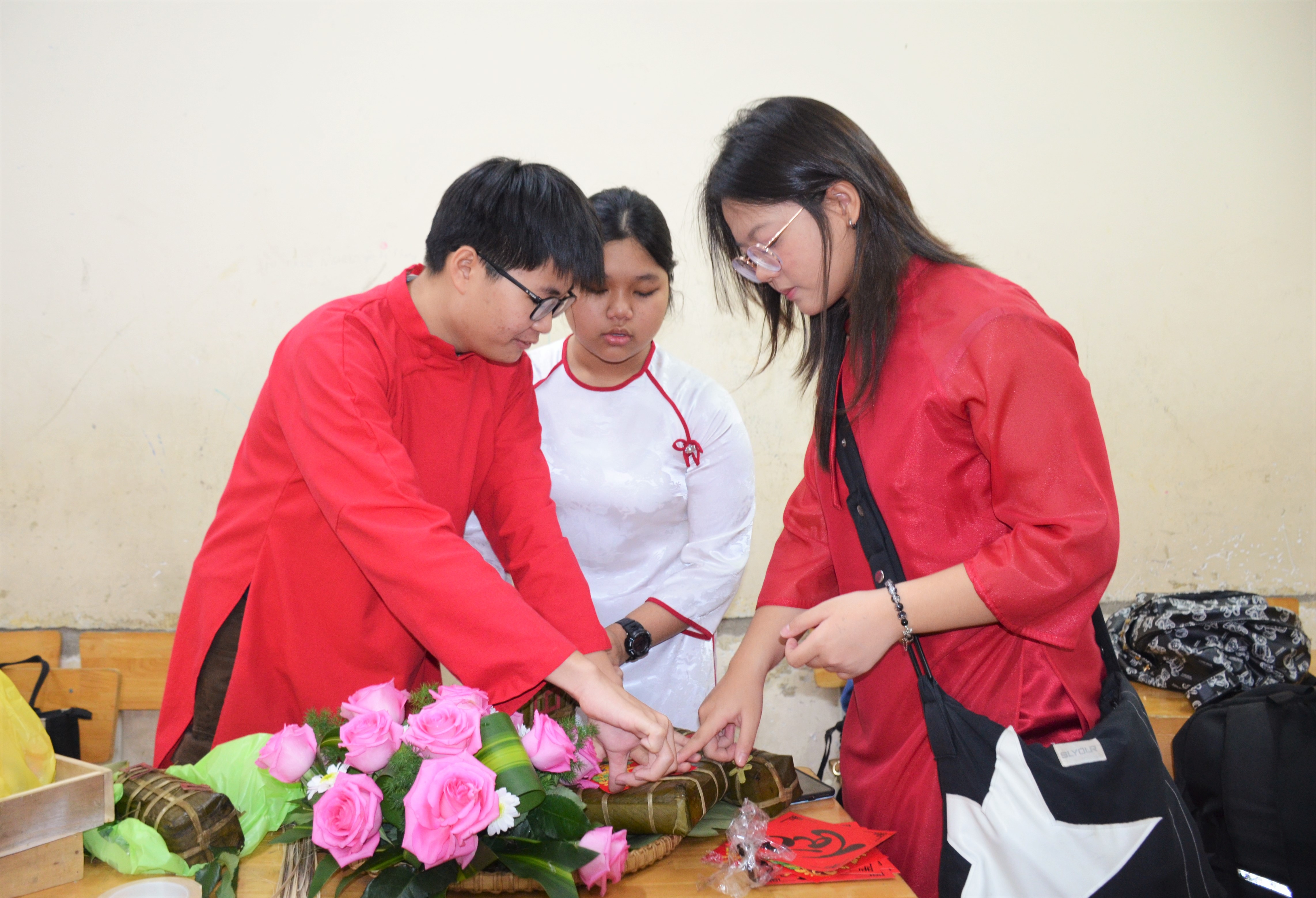 Các giáo viên, học sinh của Trường THCS Nguyễn Hiền trưng bày bánh chưng, bánh tét.