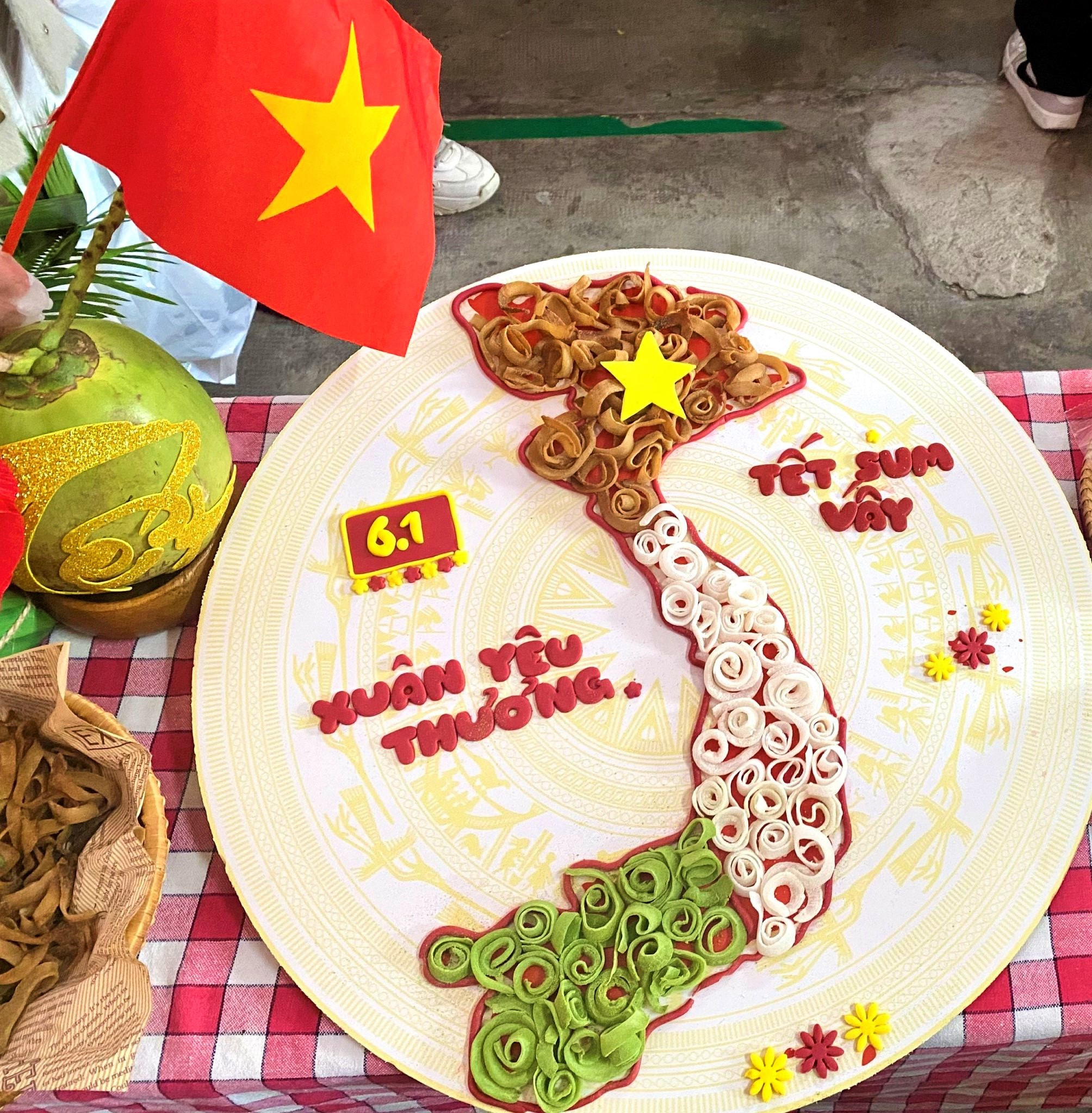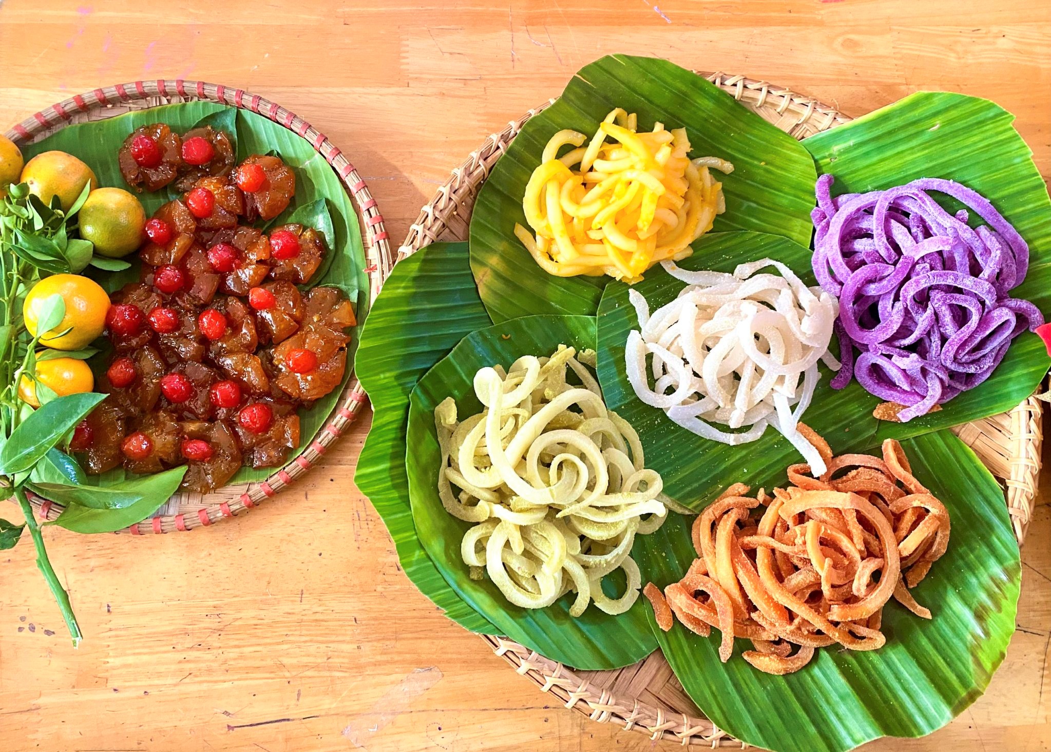 Các em học sinh của Trường THCS Nguyễn Hiền trưng bày mứt Tết.