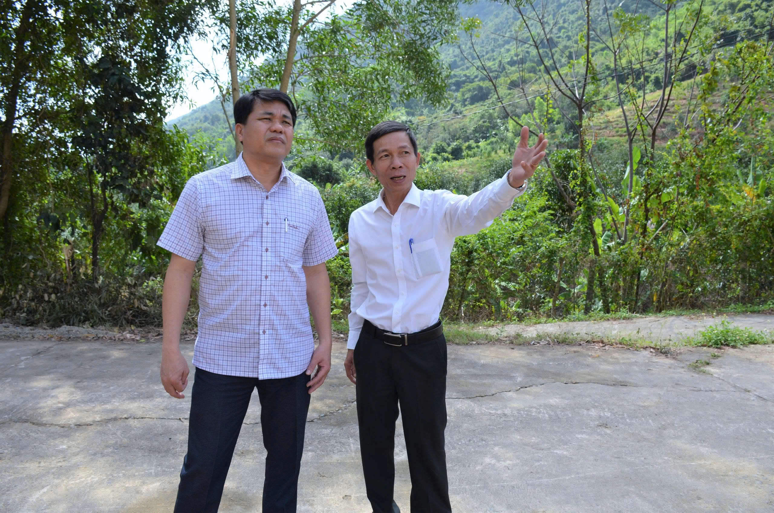 Ông Nguyễn Duy Quang (bên trái) và ông Nguyễn Văn Minh (bên phải) khảo sát tại khu vực bố trí sân khấu, khán đài.