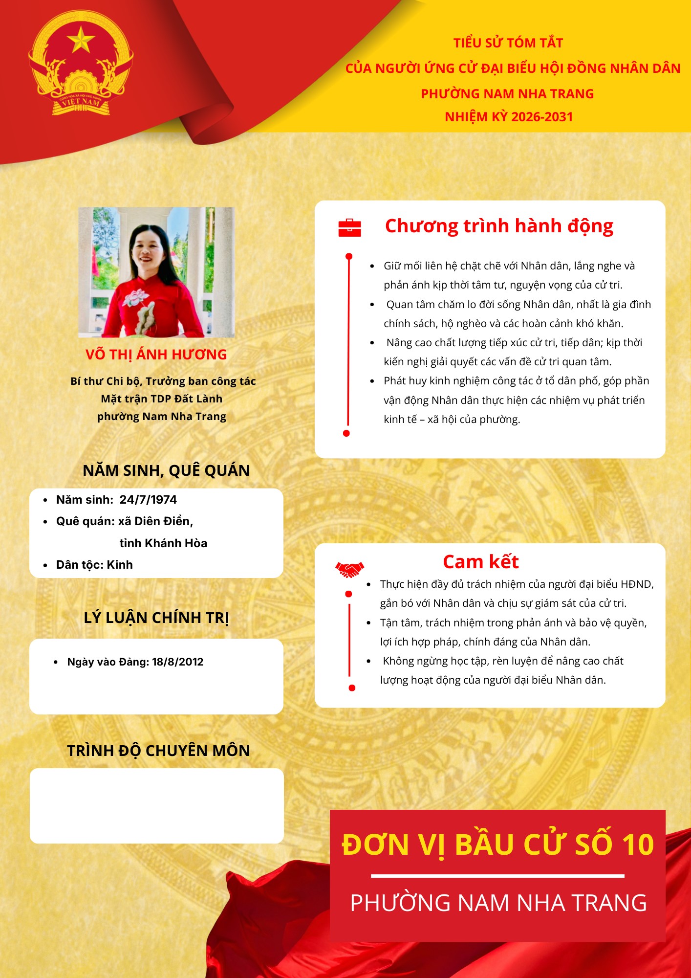 Bài viết: Chương trình hành động của người ứng cử đại biểu HĐND phường Nam Nha Trang nhiệm kỳ 2026-2031 (đ/c Võ Thị Ánh Hương)