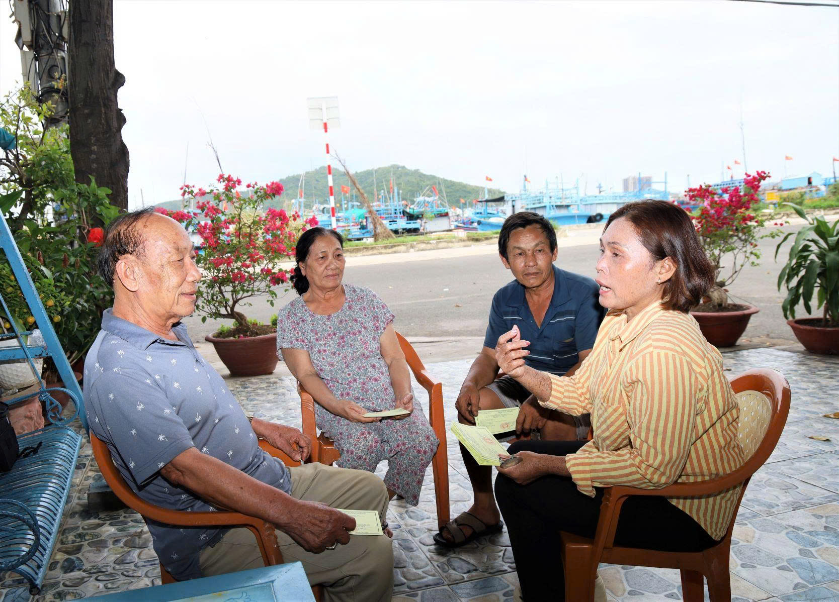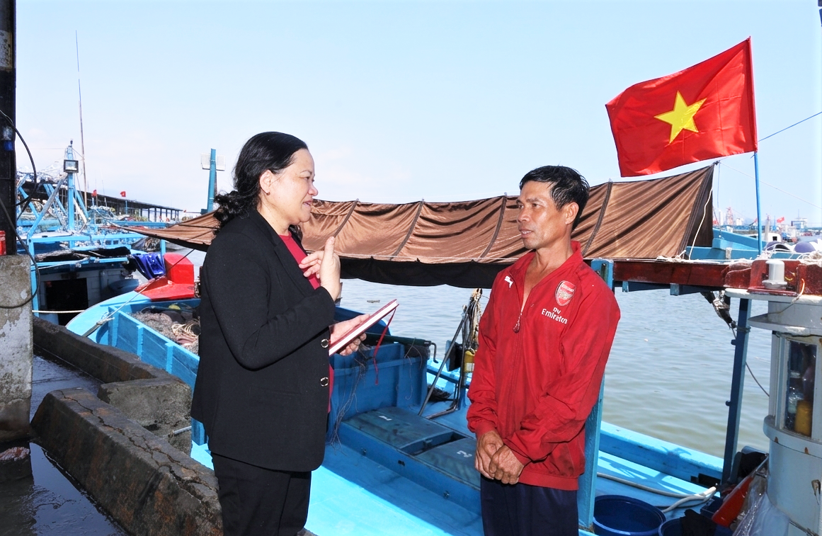 Bà Nguyễn Thị Ngọc Dung (bìa phải) tuyên truyền ngư dân tham gia bầu cử.