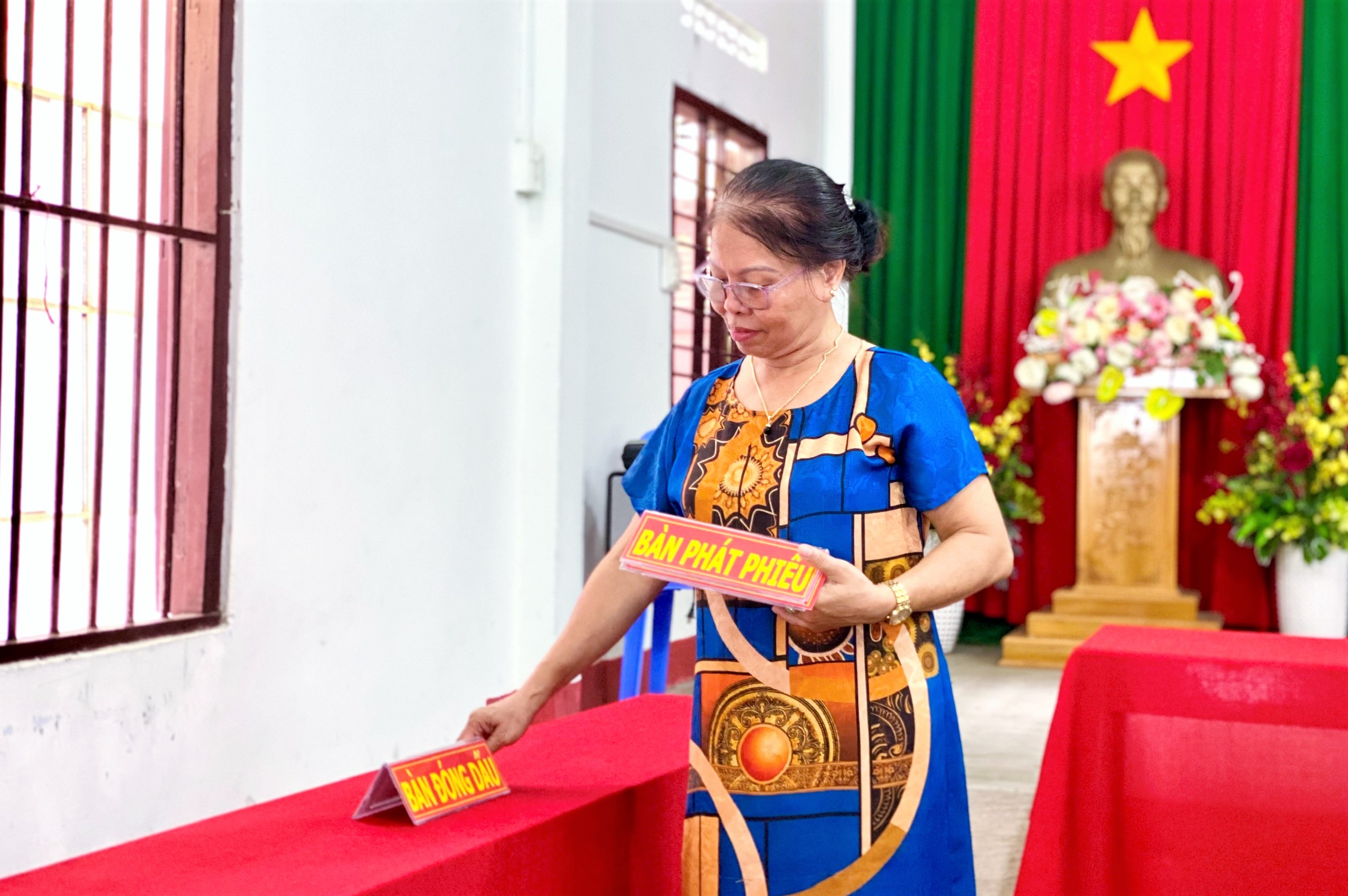 Bà Mai Thị Hồng Lê (bên trái) phát thẻ cử tri.