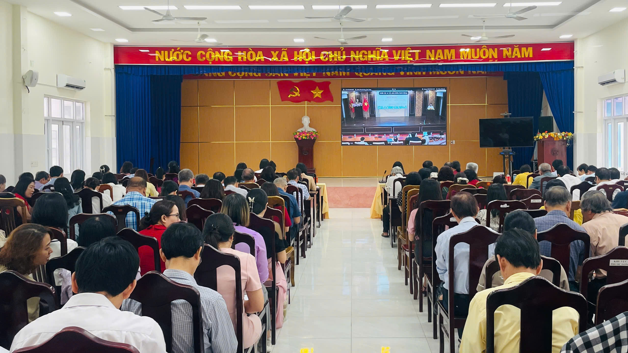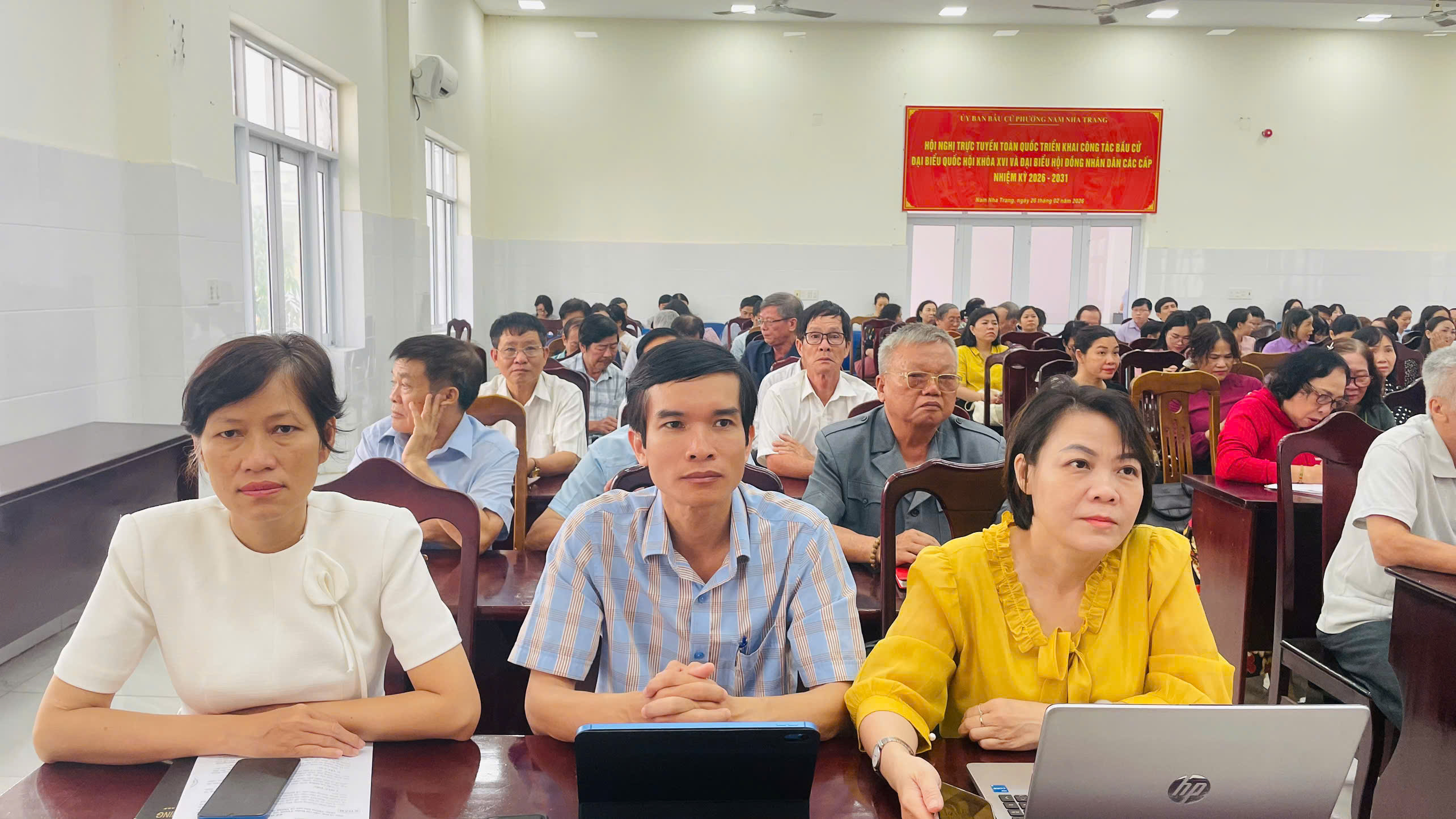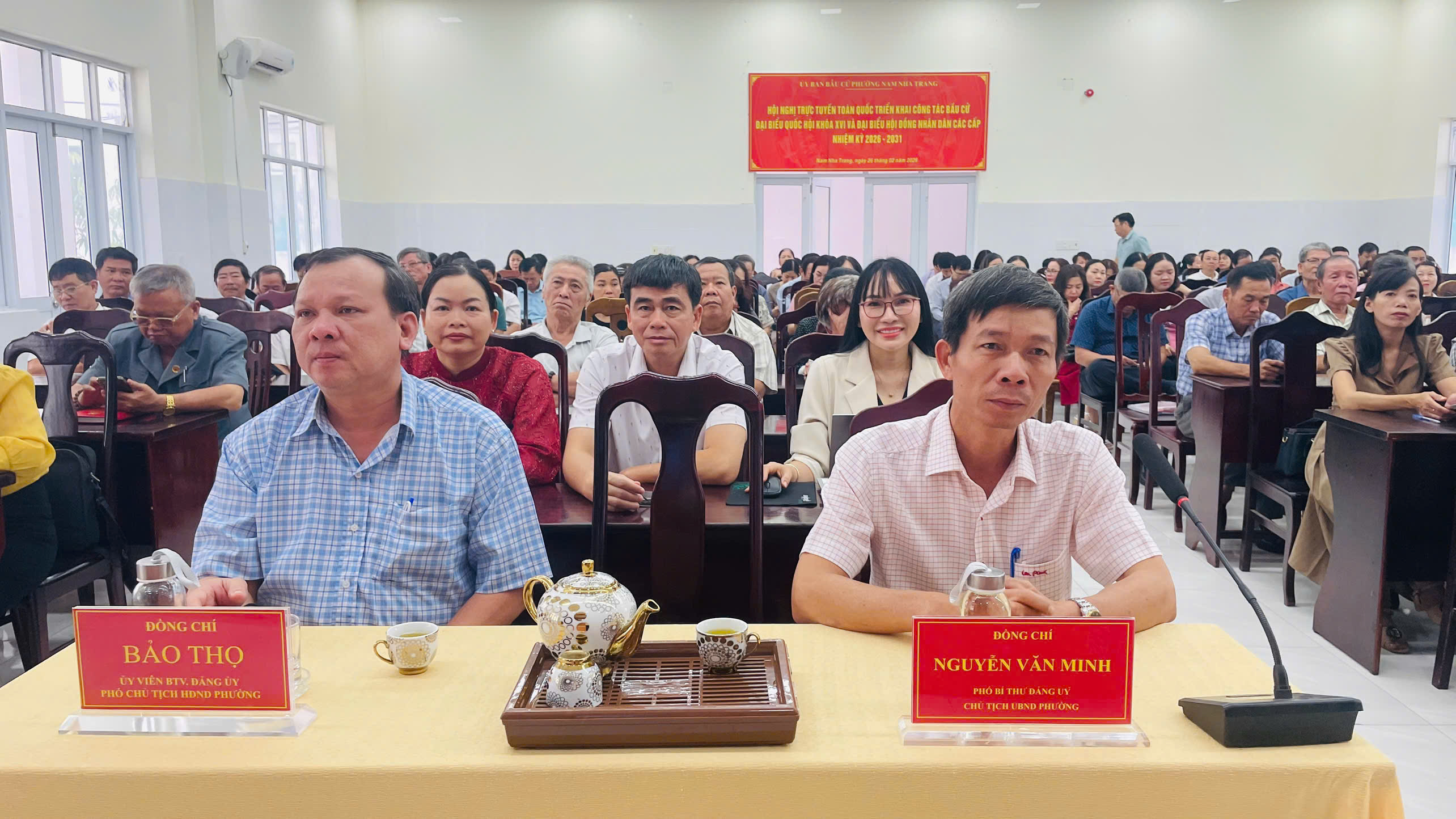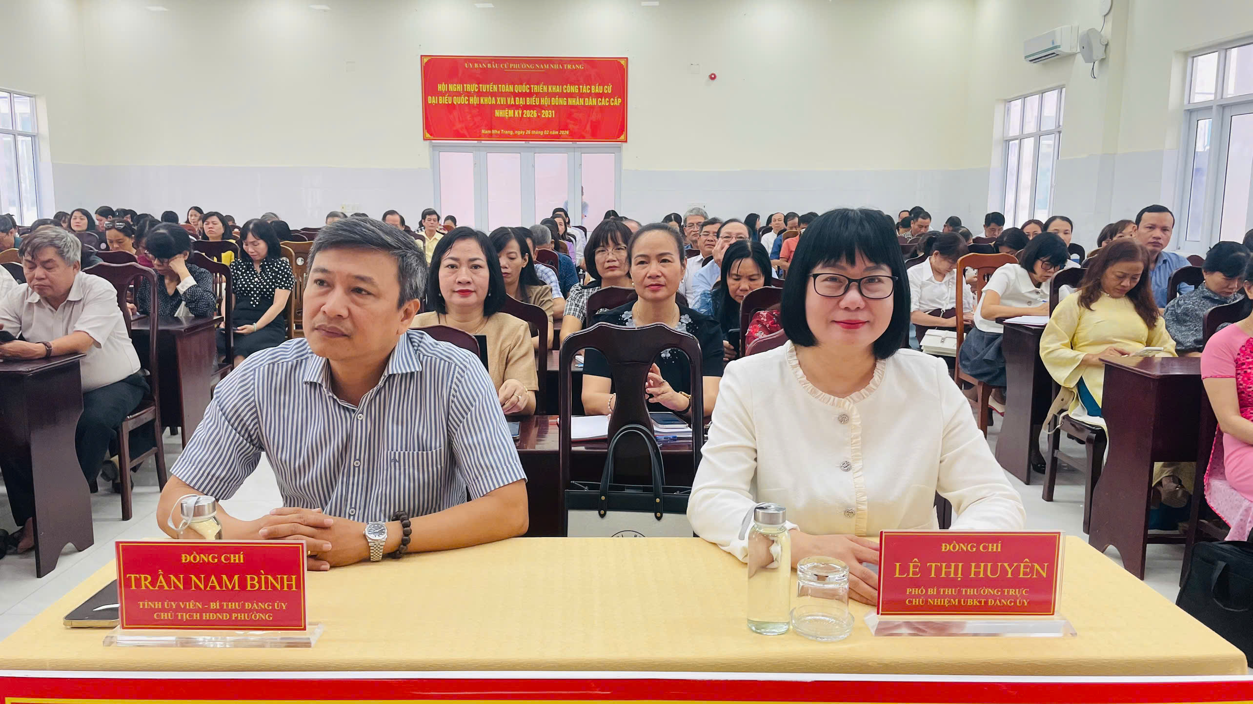 Tại điểm cầu Đảng ủy phường Nam Nha Trang, tham dự có các đồng chí: Trần Nam Bình - Tỉnh ủy viên, Bí thư Đảng ủy, Chủ tịch HĐND phường; Lê Thị Huyên - Phó Bí thư Thường trực Đảng ủy, Chủ nhiệm Ủy ban Kiểm tra Đảng ủy phường; Nguyễn Văn Minh - Phó Bí thư Đảng ủy, Chủ tịch UBND phường; các đồng chí trong Ủy viên Ban Thường vụ Đảng ủy, Ban Chấp hành Đảng bộ phường, Ủy ban Kiểm tra Đảng ủy phường; cấp trưởng, cấp phó của các cơ quan tham mưu, giúp việc Đảng ủy, Ủy ban Mặt trận Tổ quốc Việt Nam phường, các tổ chức chính trị - xã hội, tổ chức quần chúng do Đảng, Nhà nước giao nhiệm vụ của phường; các phòng, ban, đơn vị sự nghiệp thuộc UBND phường; bí thư, phó bí thư tổ chức Đảng trực thuộc; chuyên viên Ban Xây dựng Đảng phụ trách công tác tuyên giáo và dân vận; tổ trưởng, thư ký 35 tổ bầu cử.