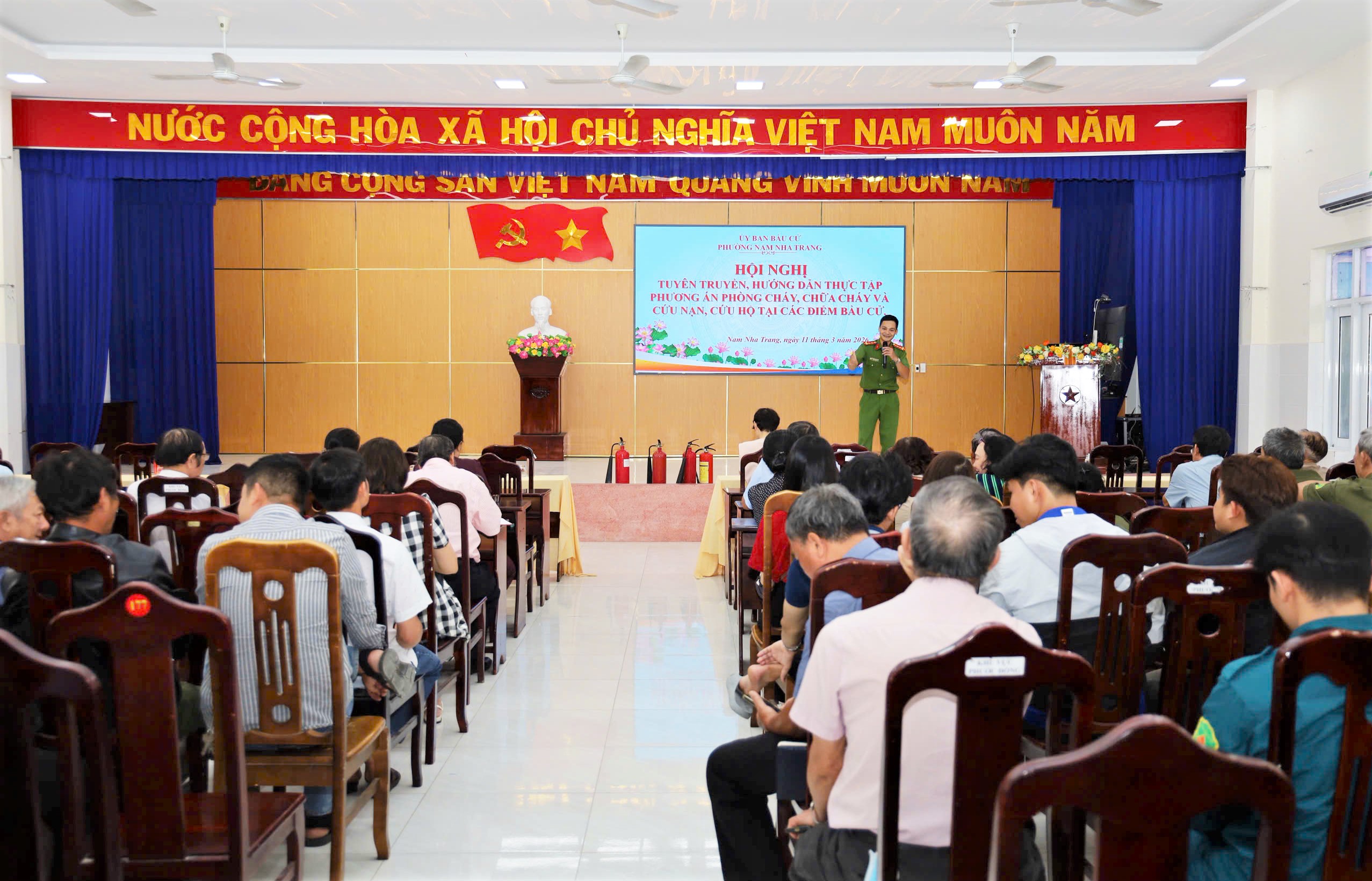 Chiều 11/3, tại Hội trường UBND phường Nam Nha Trang, Ủy ban Bầu cử phường phối hợp với Phòng Cảnh sát Phòng cháy, chữa cháy và Cứu nạn, cứu hộ (PCCC&CNCH) trực thuộc Công an tỉnh Khánh Hòa tổ chức Hội nghị tuyên truyền, hướng dẫn thực tập phương án PCCC&CNCH cho thành viên các tổ bầu cử trên địa bàn phường. Bà Hồ Thị Hải – Phó Chủ tịch UBND phường đến dự.