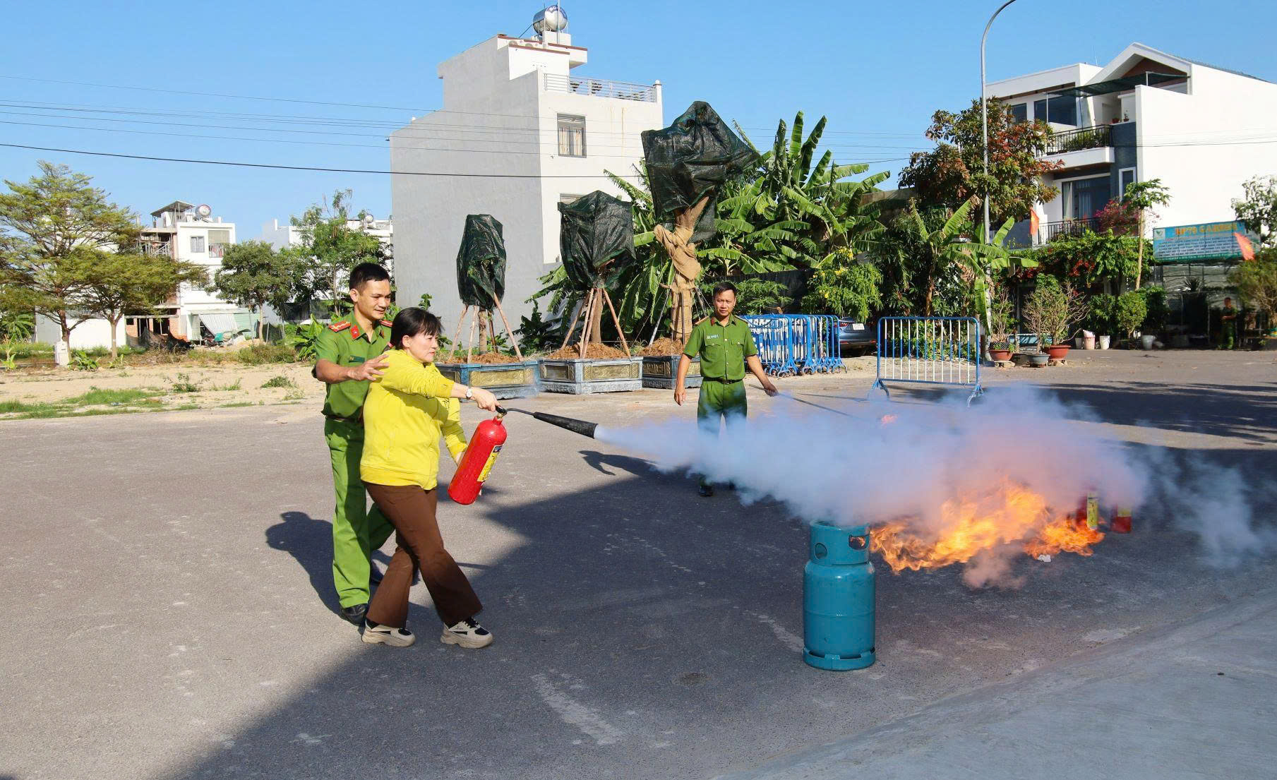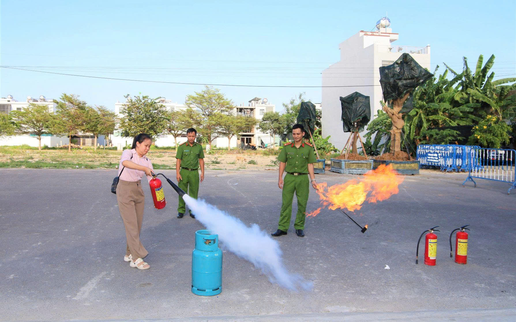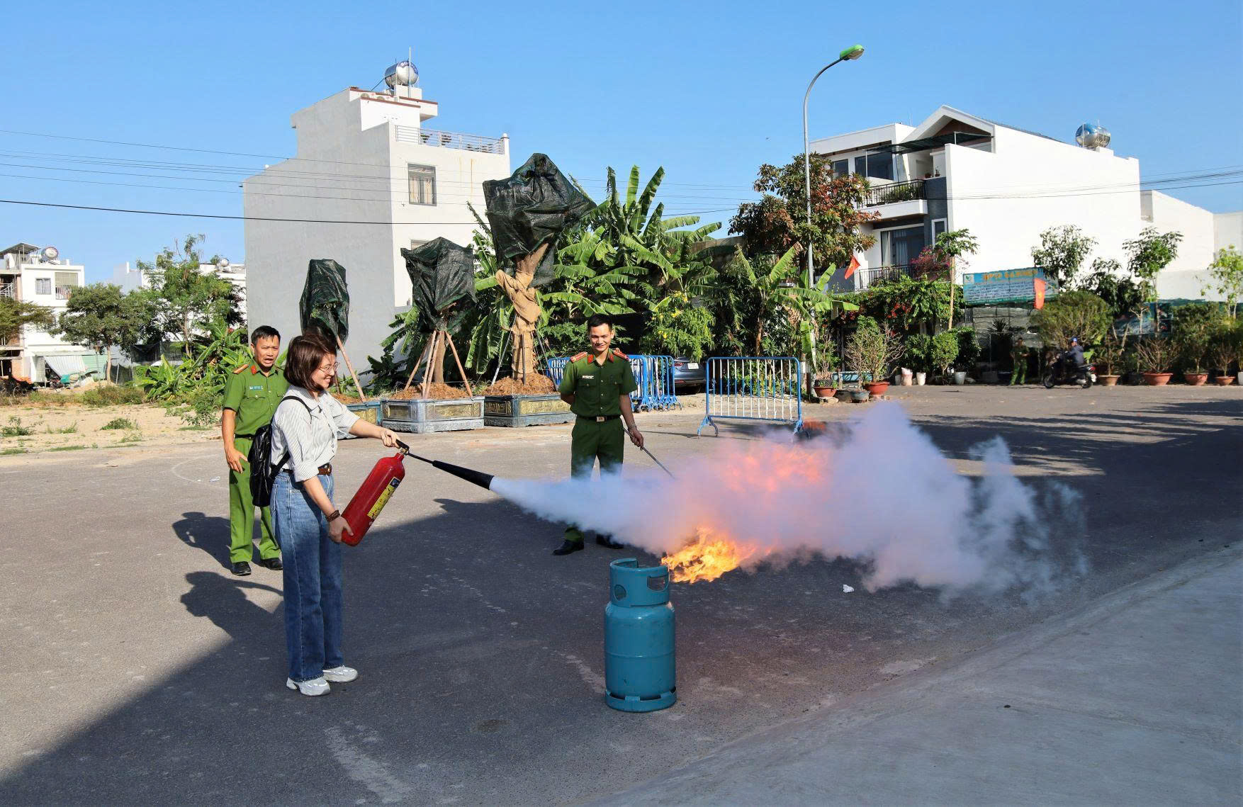 Cán bộ Phòng Cảnh sát PCCC&CNCH hướng dẫn kỹ năng sử dụng bình chữa cháy xách tay.