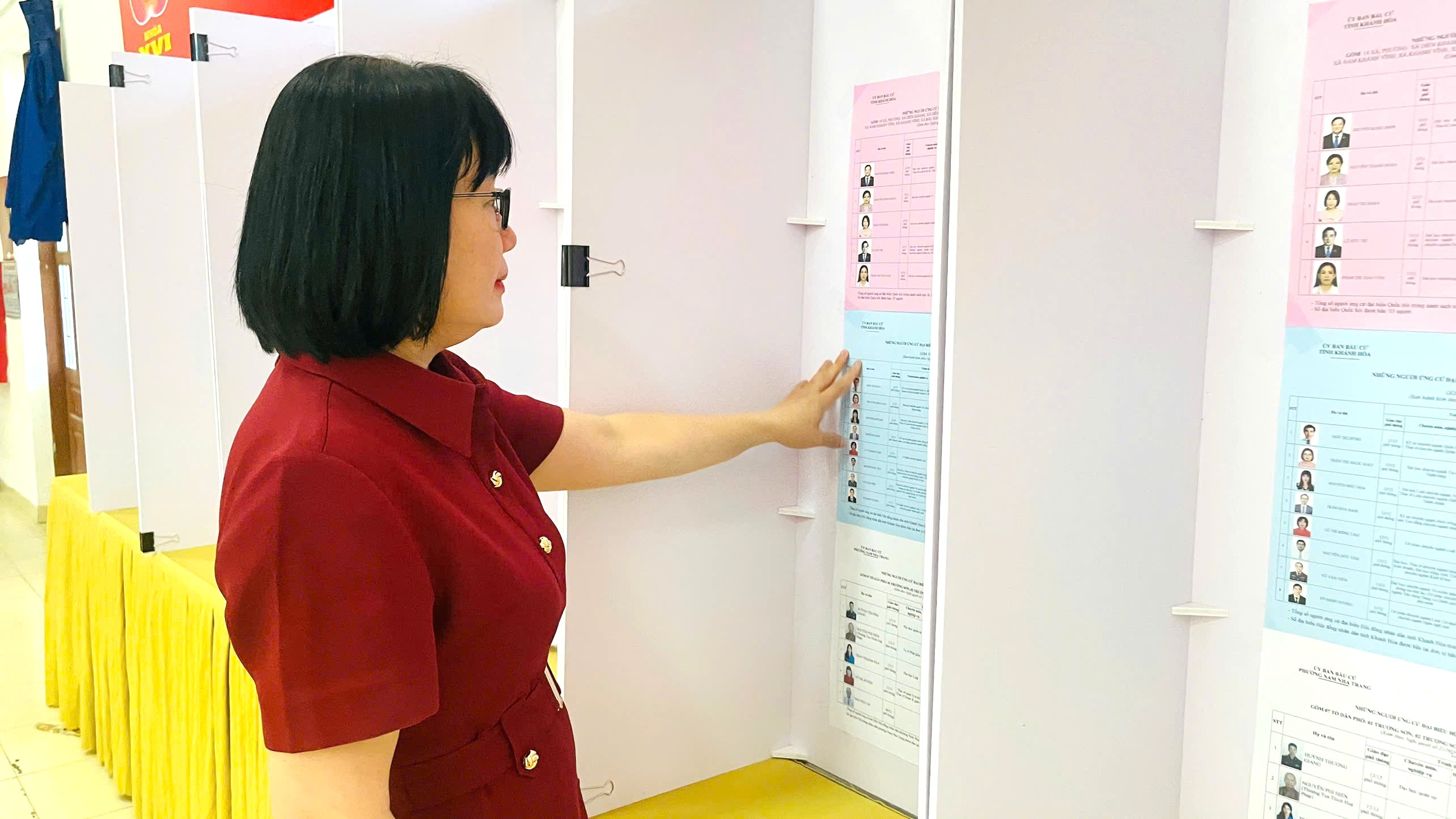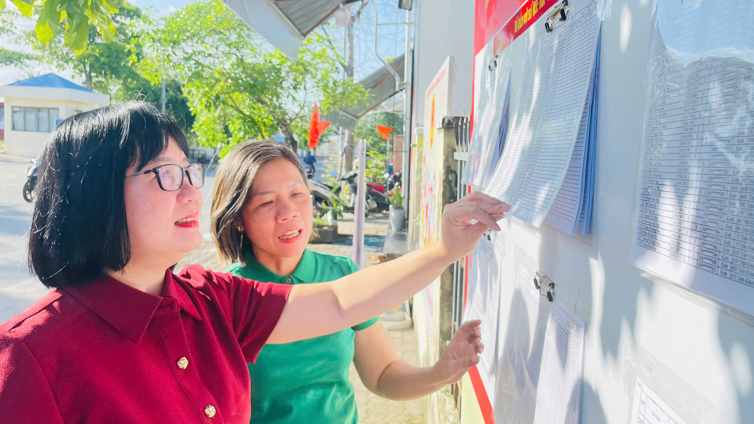 Đồng chí Lê Thị Huyên (bìa trái) kiểm tra niêm yết danh sách cử tri tại Khu vực bỏ phiếu số 5.