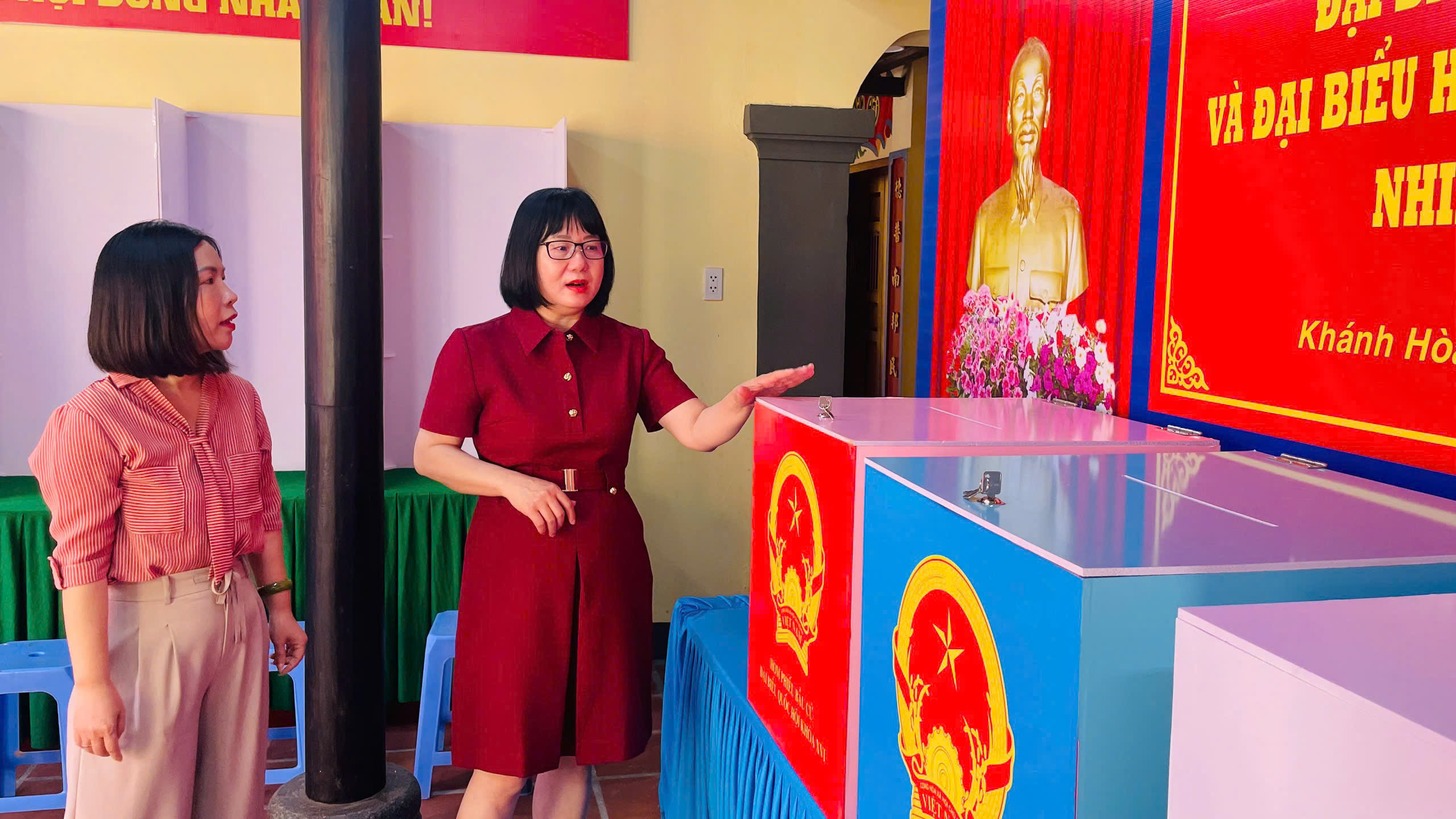 Đồng chí Lê Thị Huyên (bìa phải) kiểm tra hòm phiếu tại Khu vực bỏ phiếu số 4.
