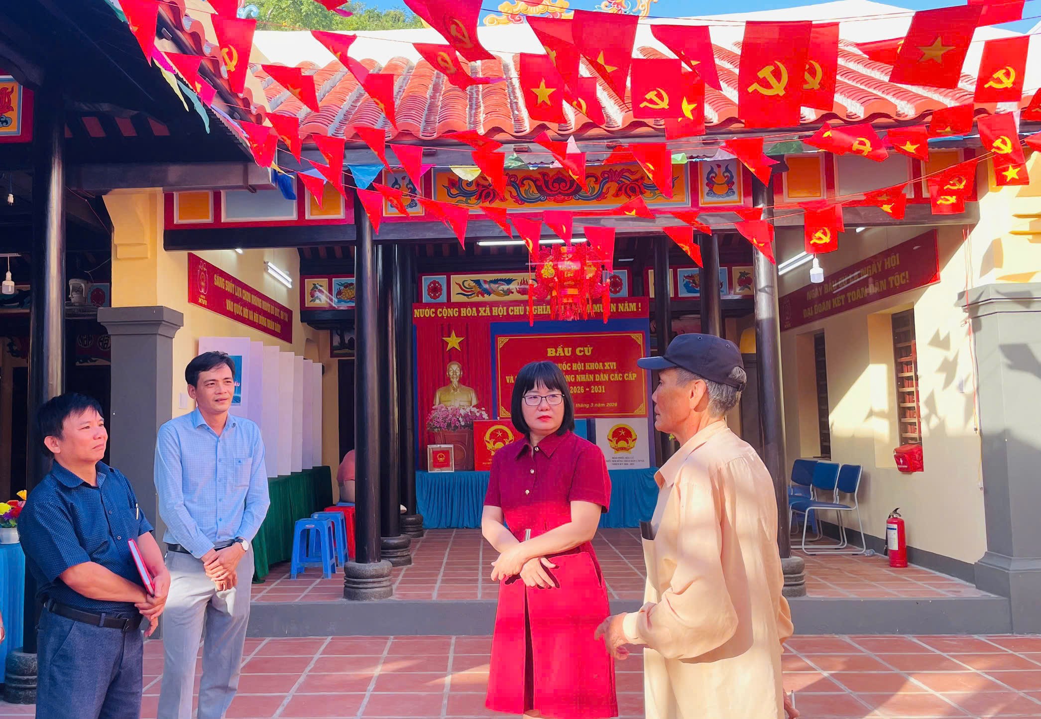 Đồng chí Lê Thị Huyên (đứng thứ 2 từ phải sang) kiểm tra công tác chuẩn bị bầu cử tại Khu vực bỏ phiếu số 4.