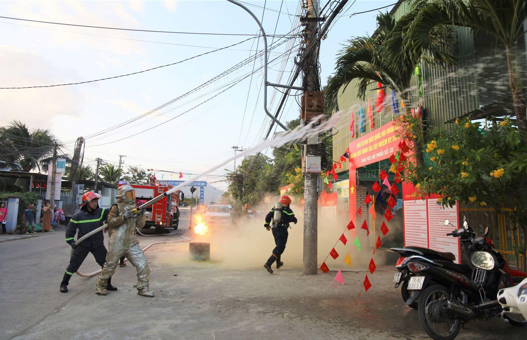 Buổi thực tập huy động gần 50 người là cán bộ, chiến sĩ Phòng Cảnh sát PCCC&CNCH, lực lượng tham gia bảo vệ tại Khu vực bỏ phiếu số 33 và viên chức, người lao động của Trường Mầm non Vĩnh Thái cùng nhiều phương tiện, trang thiết bị chữa cháy và CNCH. Nội dung thực tập theo tình huống giả định sau: Tại khu vực để xe của cử tri tham gia bầu cử, có xe máy bị rò rỉ xăng, gặp ngọn lửa trần do cử tri hút thuốc gây bắt cháy và nhanh chóng lan rộng ra khu vực xung quanh. Đám cháy tỏa ra nhiều khói, khí độc và nhiệt độ cao bao phủ toàn bộ khu vực cháy gây khó khăn cho việc chữa cháy và CNCH. Trong khi chờ đội chữa cháy của Phòng Cảnh sát PCCC&CNCH đến hiện trường, tổ bầu cử, lực lượng PCCC&CNCH tại chỗ và các lực lượng liên quan đã triển khai các hoạt động ứng phó theo quy trình ứng cứu khẩn cấp tại chỗ; tổ chức chữa cháy và hướng dẫn thoát nạn… Sau khoảng 10 phút, buổi thực tập đã diễn ra thành công và đạt được mục tiêu đề ra.