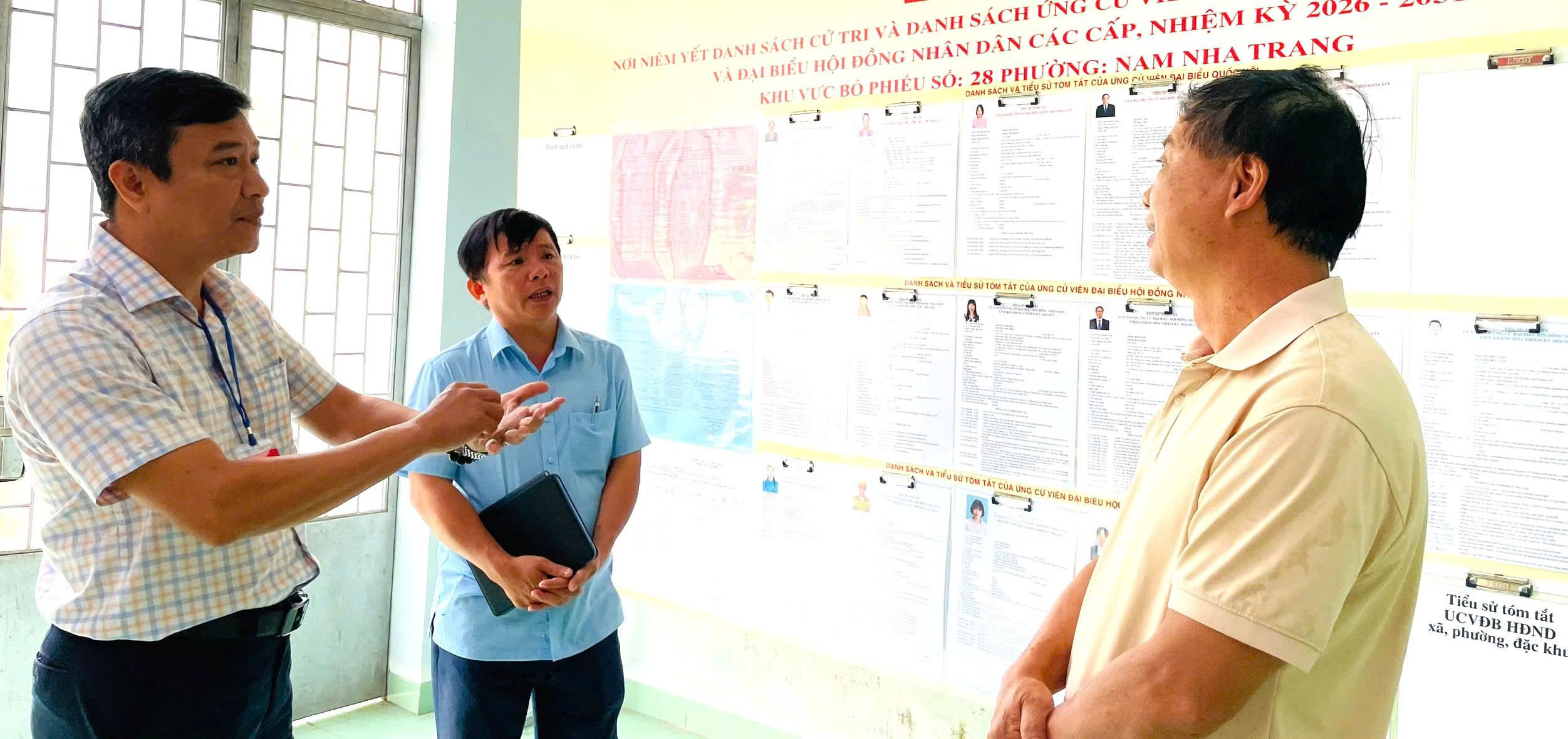Đồng chí Trần Nam Bình (bìa trái) kiểm tra công tác chuẩn bị bầu cử tại Khu vực bỏ phiếu số 28.