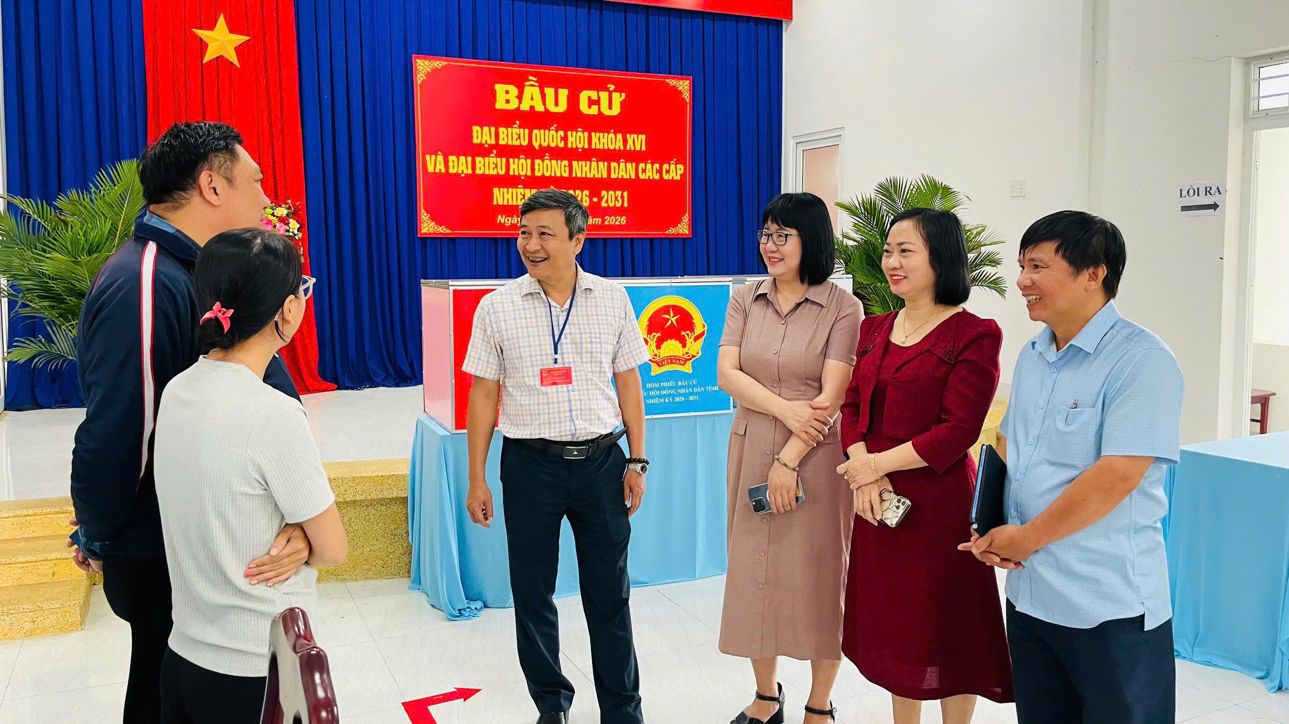 Đồng chí Trần Nam Bình (thứ 4 từ phải sang) và đồng chí Lê Thị Huyên – Phó Bí thư Thường trực Đảng ủy, Chủ nhiệm Ủy ban Kiểm tra Đảng ủy, Phó Trưởng Ban Chỉ đạo về công tác bầu cử phường (thứ 3 từ phải sang) kiểm tra công tác chuẩn bị bầu cử tại Khu vực bỏ phiếu số 34.