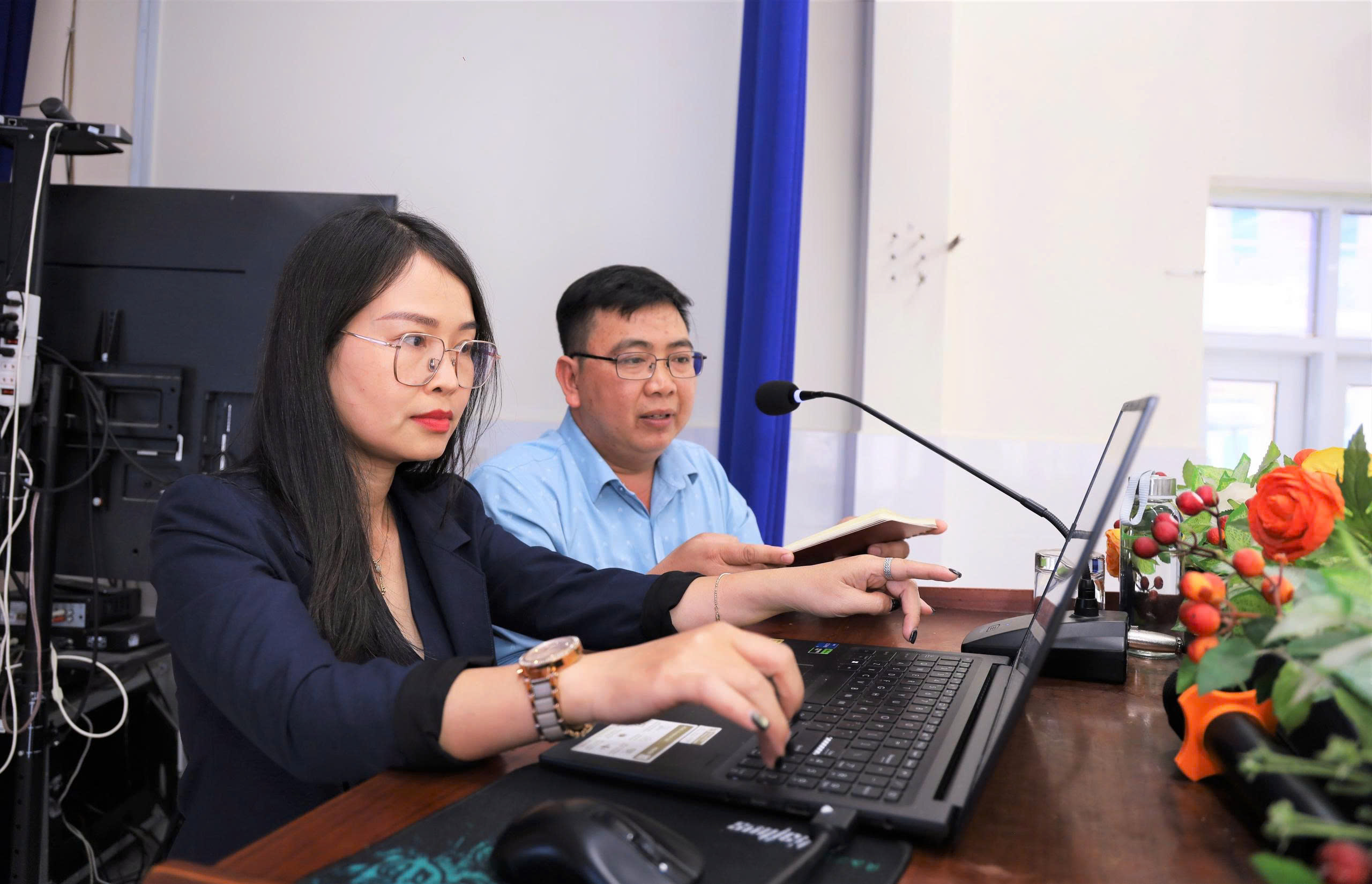 Thành viên tổ bầu cử thực hành sử dụng phần mềm Excel để kiểm đếm phiếu bầu cử.
