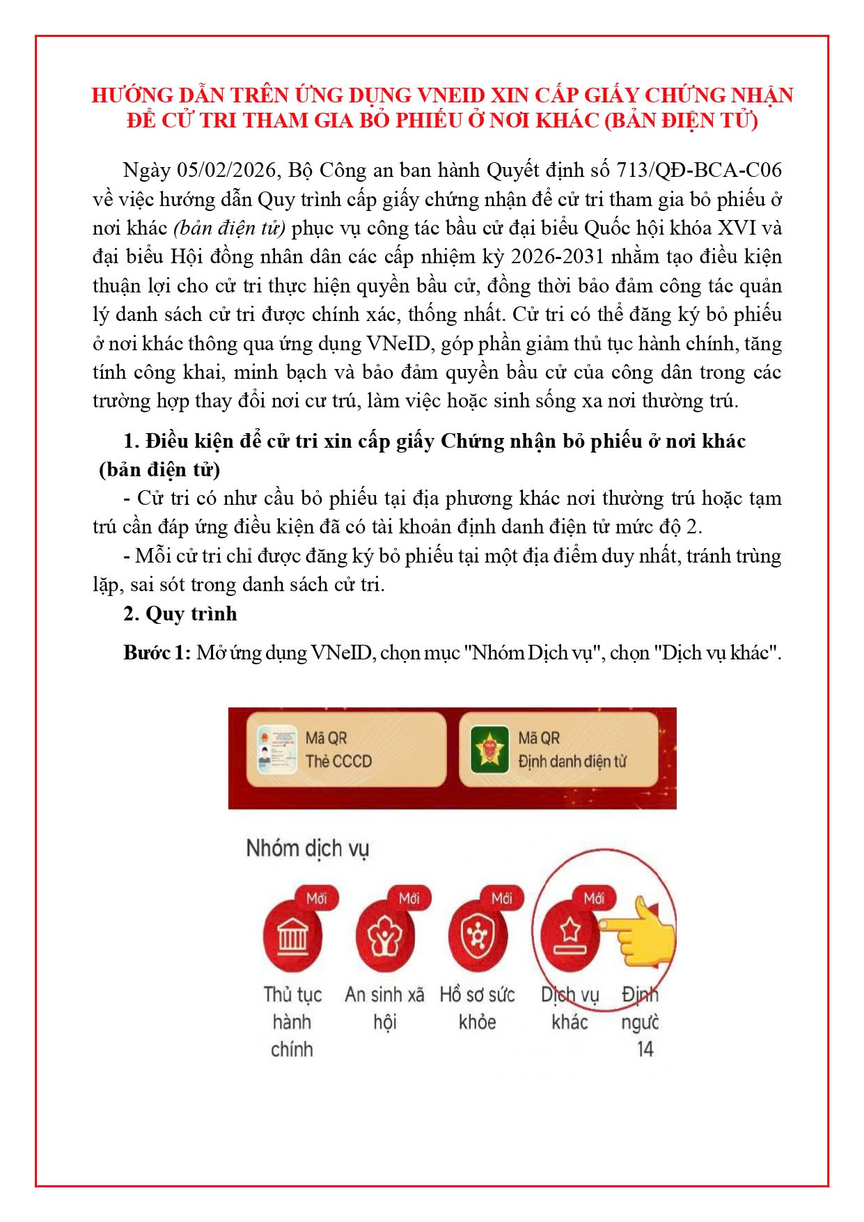 Bài viết: HƯỚNG DẪN TRÊN ỨNG DỤNG VNEID XIN CẤP GIẤY CHỨNG NHẬN ĐỂ CỬ TRI THAM GIA BỎ PHIẾU Ở NƠI KHÁC (BẢN ĐIỆN TỬ)